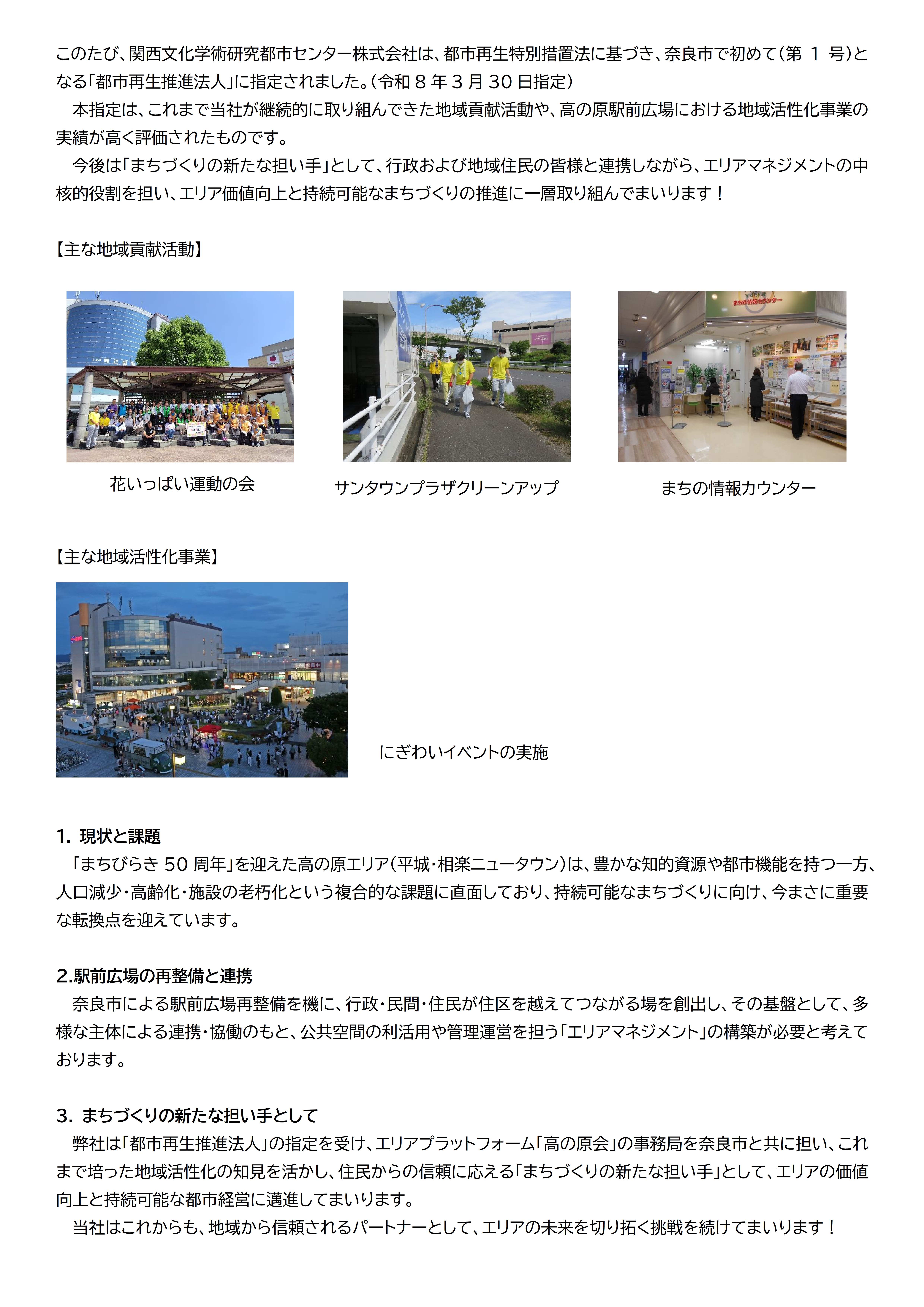 関西文化学術研究都市センター株式会社が、奈良市初の「都市再生推進法人」に指定されました!